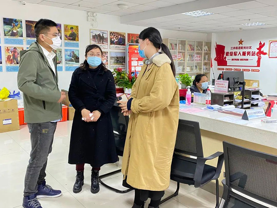 瑞新黨支部慰問組來到三井街道陽光社區(qū)后,贈送了生活物資,并和社區(qū)工作人員進行了深入的交流,對這些一線工作者所展現(xiàn)的勇于擔當、敢于奉獻的高尚品德表示了敬意和問候!三井街道陽光社區(qū)黨支部書記潘雙表示:“這一輪疫情以來,我們社區(qū)職工聞令而動,不辭辛苦,配合醫(yī)務人員為每一位患者提供服務,他們也以自己職業(yè)的素養(yǎng),守護著這座城市的健康安全,所以我想代表社區(qū)職工感謝瑞新黨支部,你們?yōu)槲覀兯蛠淼倪@一份守護和關愛,不僅是一份健康的守護,更是一份直達人心的溫暖。”