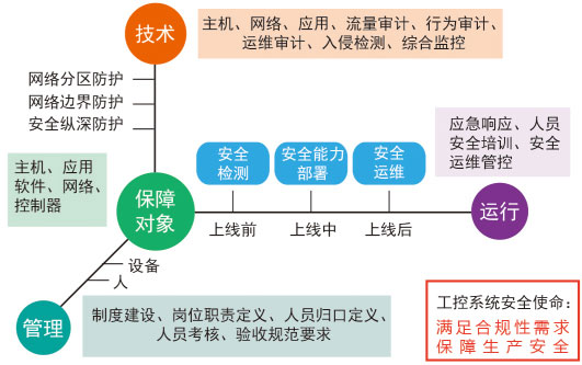 工控系統(tǒng)總體安全保障從技術(shù)、管理和運(yùn)行三個(gè)維度來保障工業(yè)控制系統(tǒng)安全。三個(gè)保障維度中主要包含:網(wǎng)絡(luò)邊界防護(hù)、安全縱深防護(hù)、安全運(yùn)行管理和安全管理制度要求等幾個(gè)方面,融合了技術(shù)、管理和運(yùn)行的要求來保障工業(yè)控制系統(tǒng)的安全。同時(shí)結(jié)合工業(yè)控制系統(tǒng)運(yùn)行階段的特點(diǎn)提出針對(duì)工業(yè)控制系統(tǒng)的三個(gè)能力建設(shè),包含從上線前的安全檢測(cè)、安全能力部署、安全運(yùn)行三個(gè)階段,覆蓋工業(yè)控制系統(tǒng)運(yùn)行周期的安全保障。