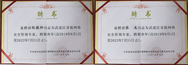 首頁 > 資訊中心 > 喜報(bào)榮譽(yù)通報(bào) > 瑞新股份倪德帥、張龍受聘武進(jìn)區(qū)首批網(wǎng)絡(luò)安全咨詢專家