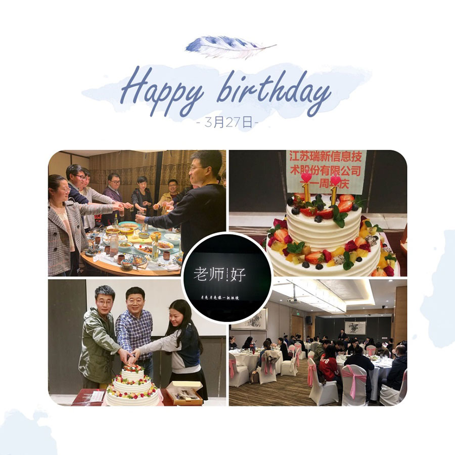 2019年3月27日,迎來(lái)了瑞新股份第11個(gè)生日。為了慶祝這一特殊的日子,下午2點(diǎn)30分,常州總部員工在常州大劇院觀看電影《老師好》,致敬人生中遇到的每一位優(yōu)秀的老師。晚上全體員工分別在常州華美達(dá)大酒店和南京川越酒店參加聚餐,慶祝公司生辰,同時(shí)為3月份生日的員工一起慶祝生日。
