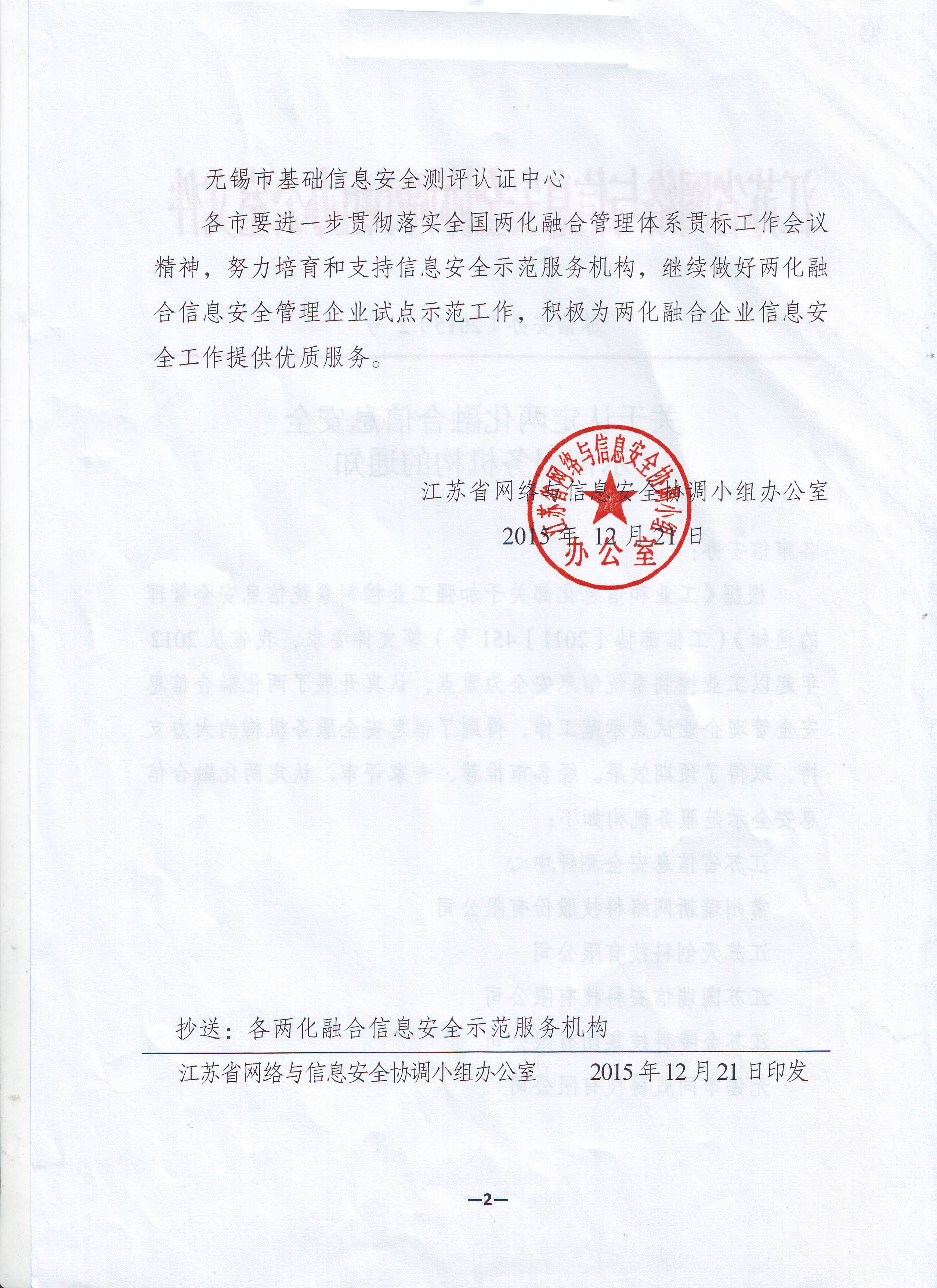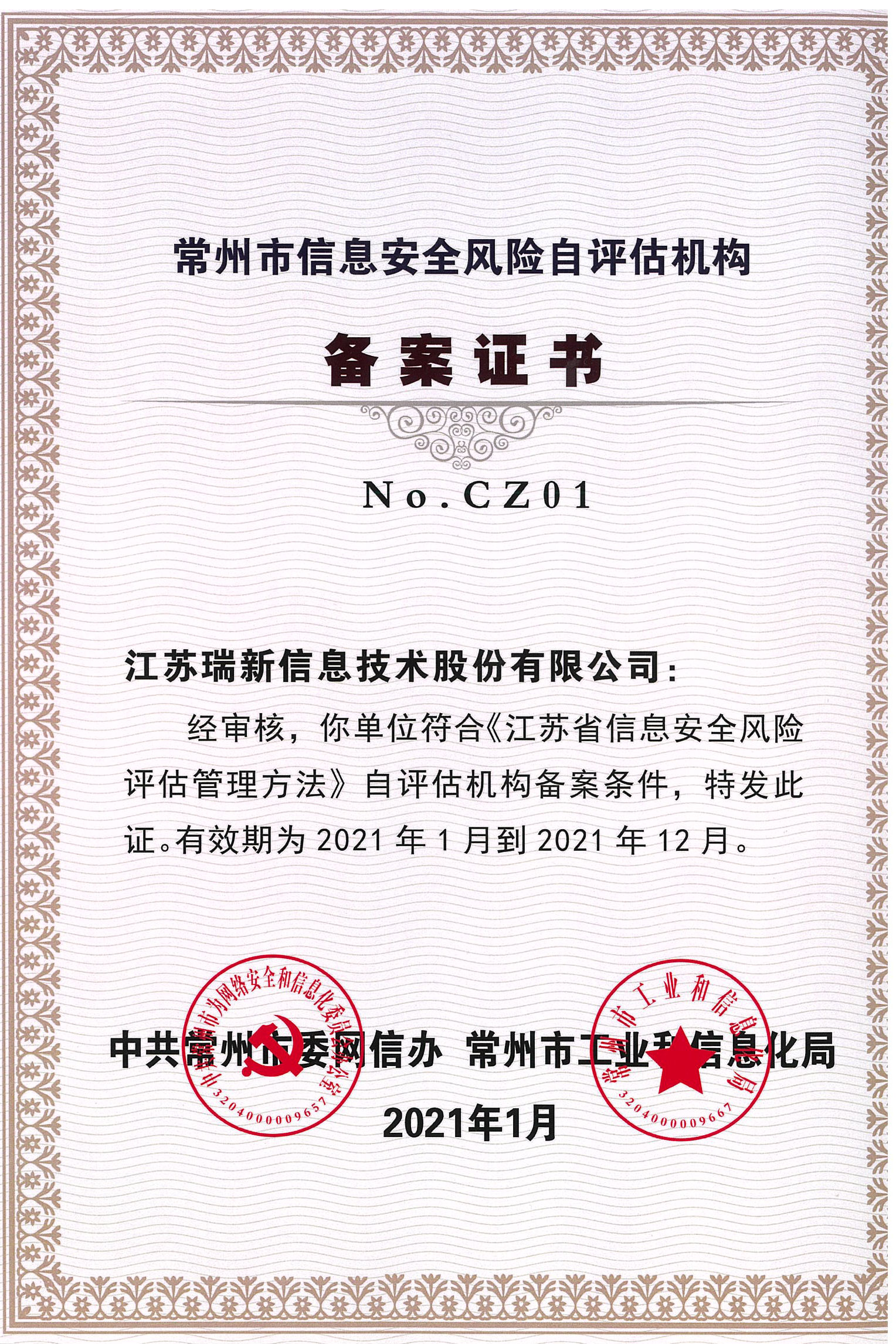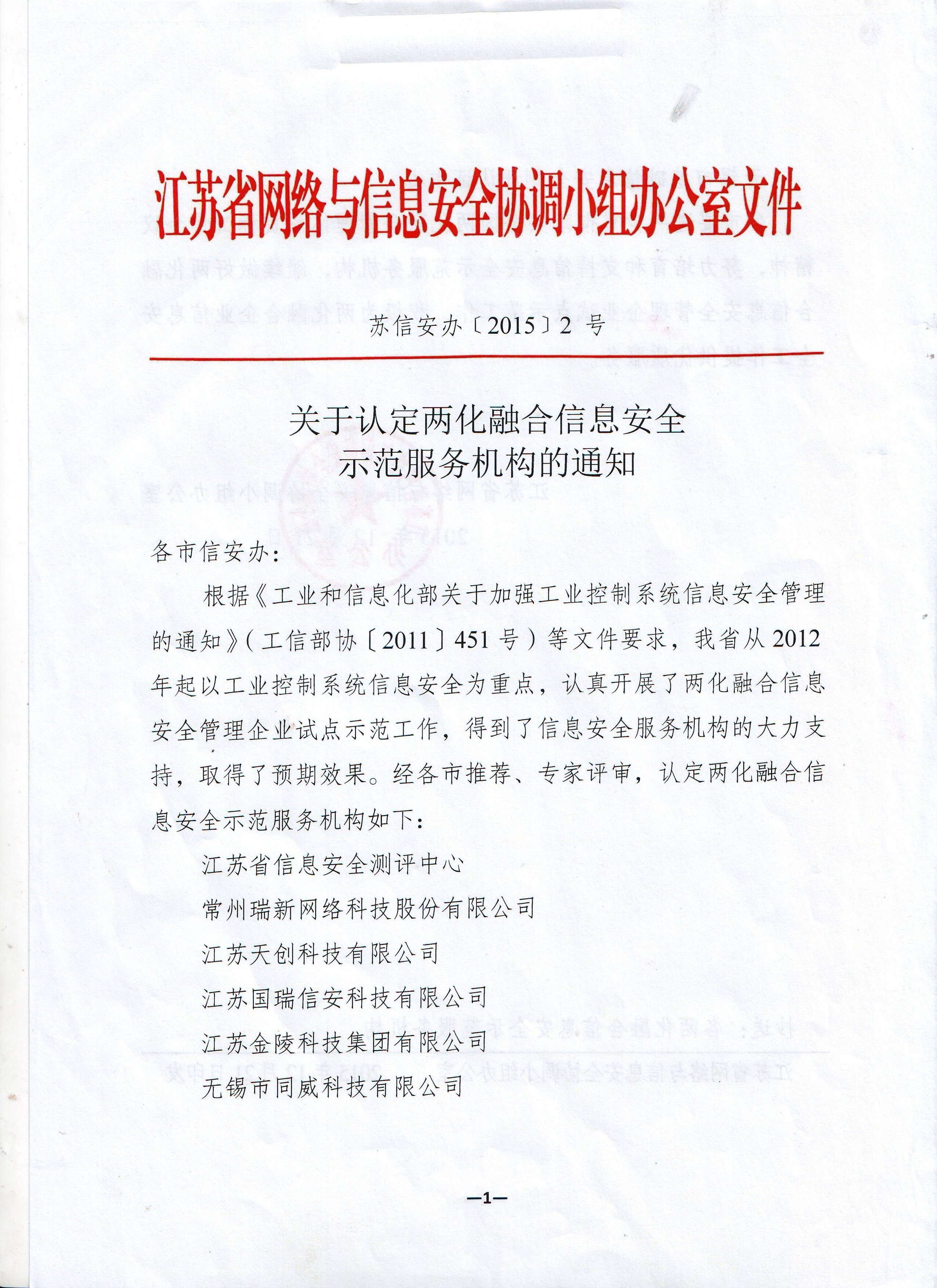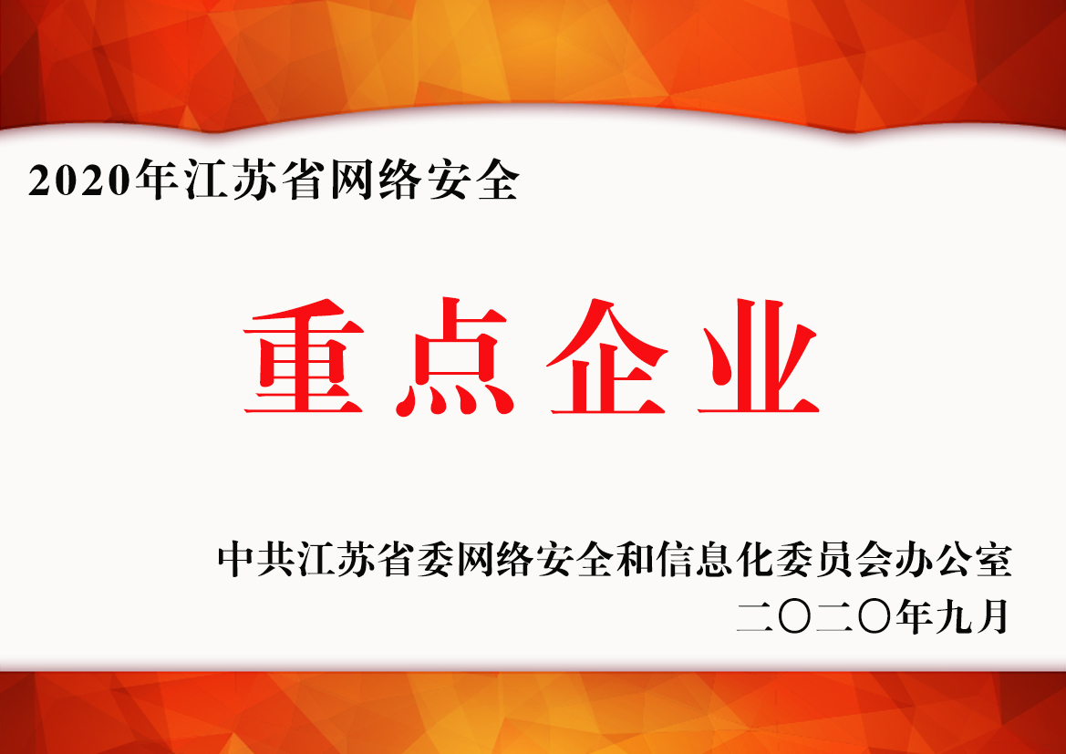 公司獲得了中國網(wǎng)絡(luò)安全審查技術(shù)與認(rèn)證中心頒發(fā)的《信息安全應(yīng)急處理》及《信息安全風(fēng)險評估》二級證書;國家信息安全測評中心頒發(fā)的《信息安全服務(wù)資質(zhì)》二級證書;江蘇省軟件行業(yè)協(xié)會頒發(fā)的《軟件企業(yè)》證書;通過了CMMI3軟件成熟度開發(fā)認(rèn)證;通過了ISO9001質(zhì)量管理體系認(rèn)證證書及27001信息安全管理體系認(rèn)證證書;是江蘇省的高新技術(shù)企業(yè)、兩化融合示范試點企業(yè)、信息安全應(yīng)急響應(yīng)支撐單位;是常州市十佳軟件企業(yè)。