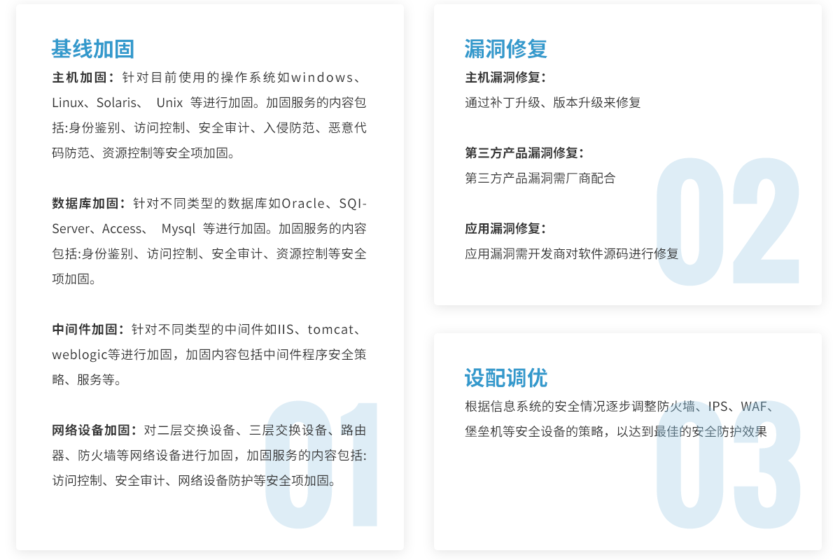 安全加固是指參考國(guó)內(nèi)國(guó)際權(quán)威的系統(tǒng)安全配置標(biāo)準(zhǔn),并結(jié)合用戶信息系統(tǒng)實(shí)際情況,在用戶允許的前提下,對(duì)信息系統(tǒng)涉及的主機(jī)、網(wǎng)絡(luò)設(shè)備、應(yīng)用及數(shù)據(jù)庫(kù)進(jìn)行安全配置加固、漏洞修復(fù)和安全設(shè)備調(diào)優(yōu)。